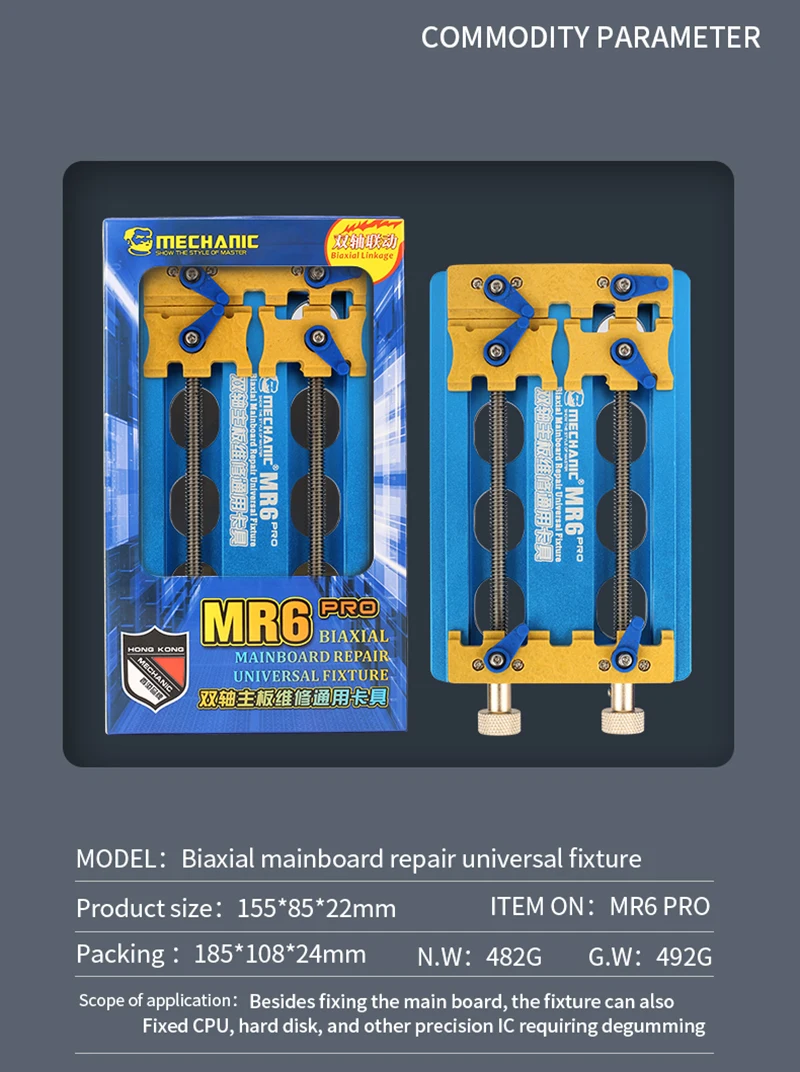 –Model : Mechanic Precision Double-Bearings Fixture –Applicable to all kinds of mobile mainboard maintenance. –The bottom material ia made of alloy steel.Stable, High temperature and corrosion resistant. –Scope of application: Besides fixing the main board, the fixture also can fixed CPU, hard disk, and other precision IC requiring degumming. –Product Size:About 155*85*22mm –Packing Size:About 185*108*24mm –Item No.MR6 PRO Package : 1 * PCB Holder